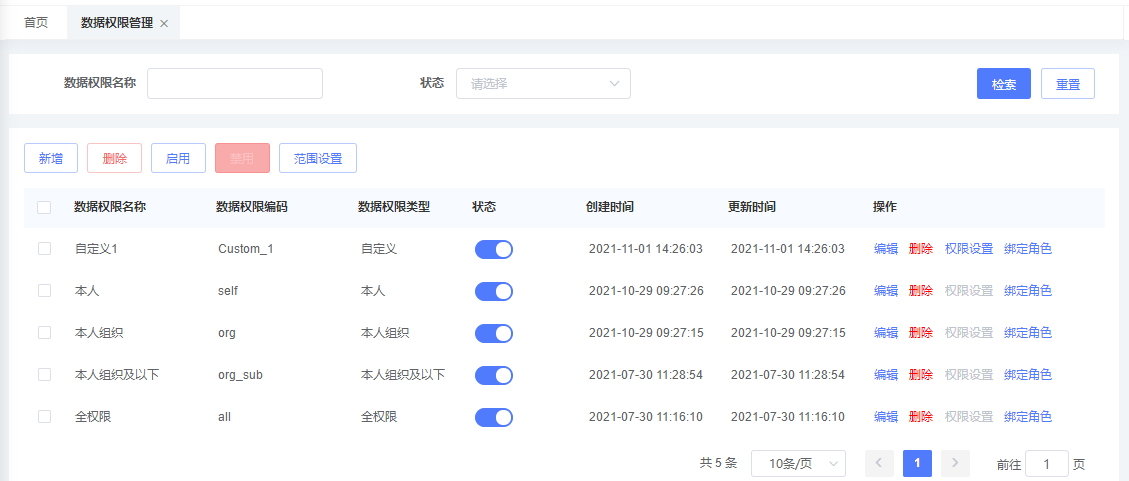 - 自定义:只能查看权限设置绑定组织的数据