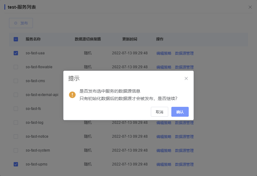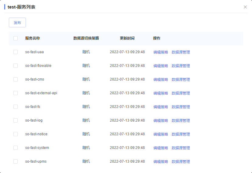 租户服务列表主要用于维护数据源的自动切换策略,并对服务进行发布。