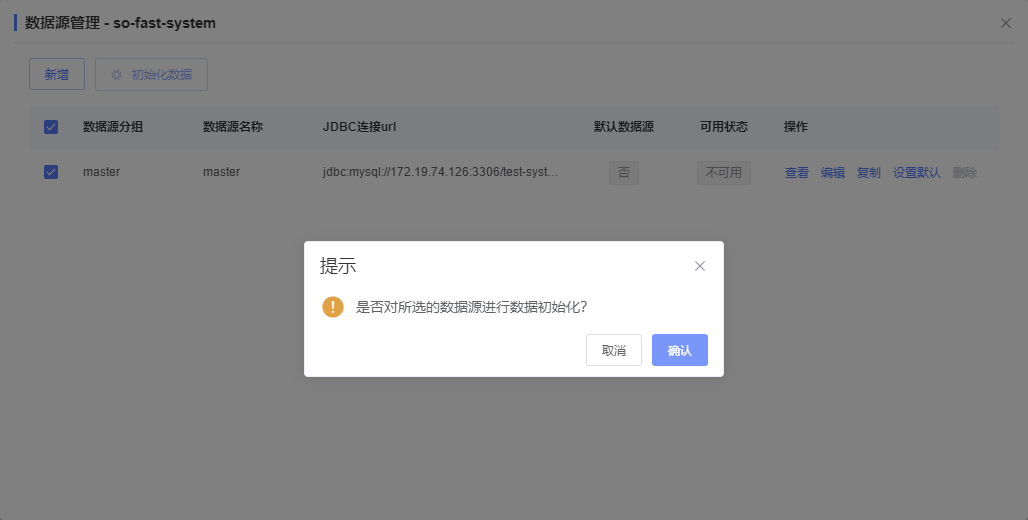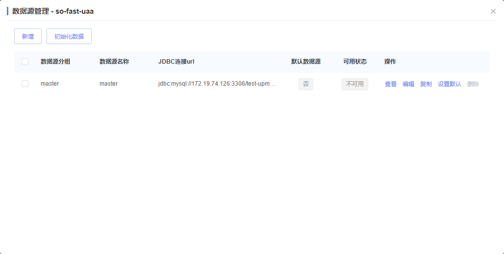 当数据库创建方式为 自动创建 ,则数据源状态默认为 不可用 ,只有进行 数据初始化 成功之后,该数据源才会变为 可用 状态