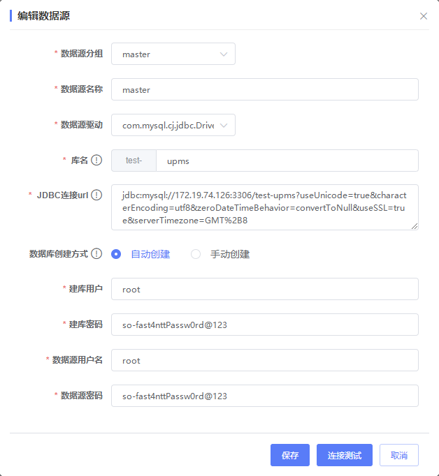 - dsGroupNames: 数据源组名称使用(多个值使用,分割)该值主要用于服务中存在多种数据源的场景,用于校验数据源创建