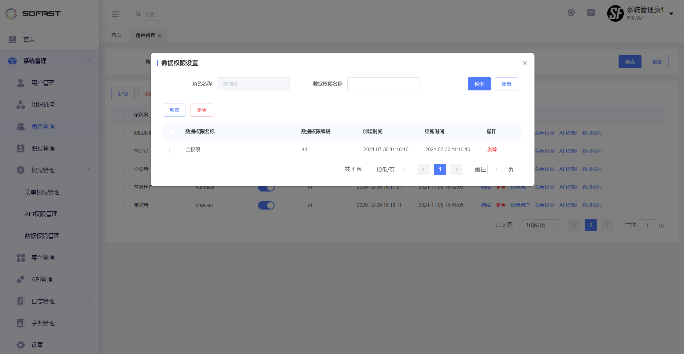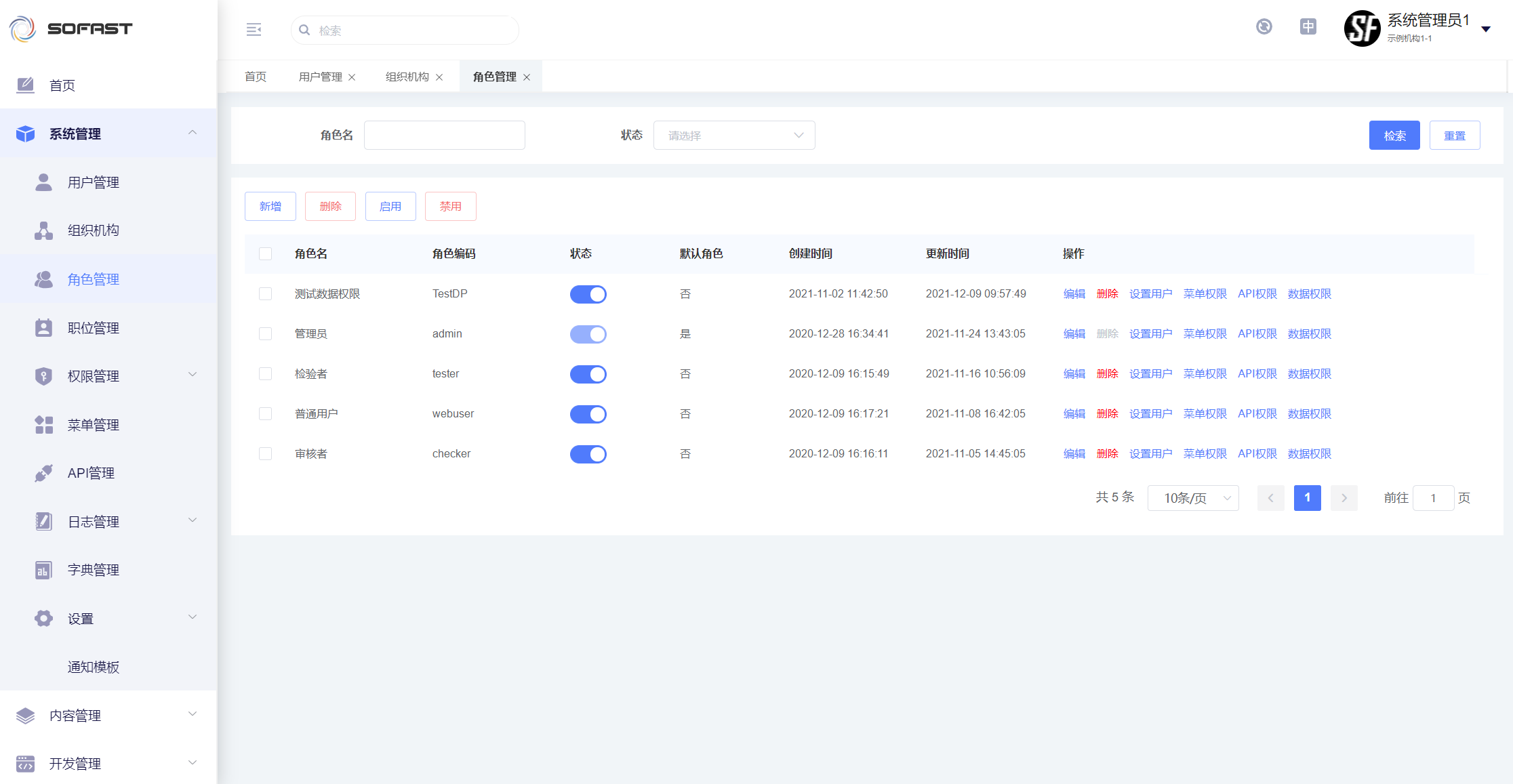 角色管理具备新增、删除、启用、禁用、编辑、设置用户、菜单权限、API权限、数据权限,根据角色名称和状态来检索数据的功能。