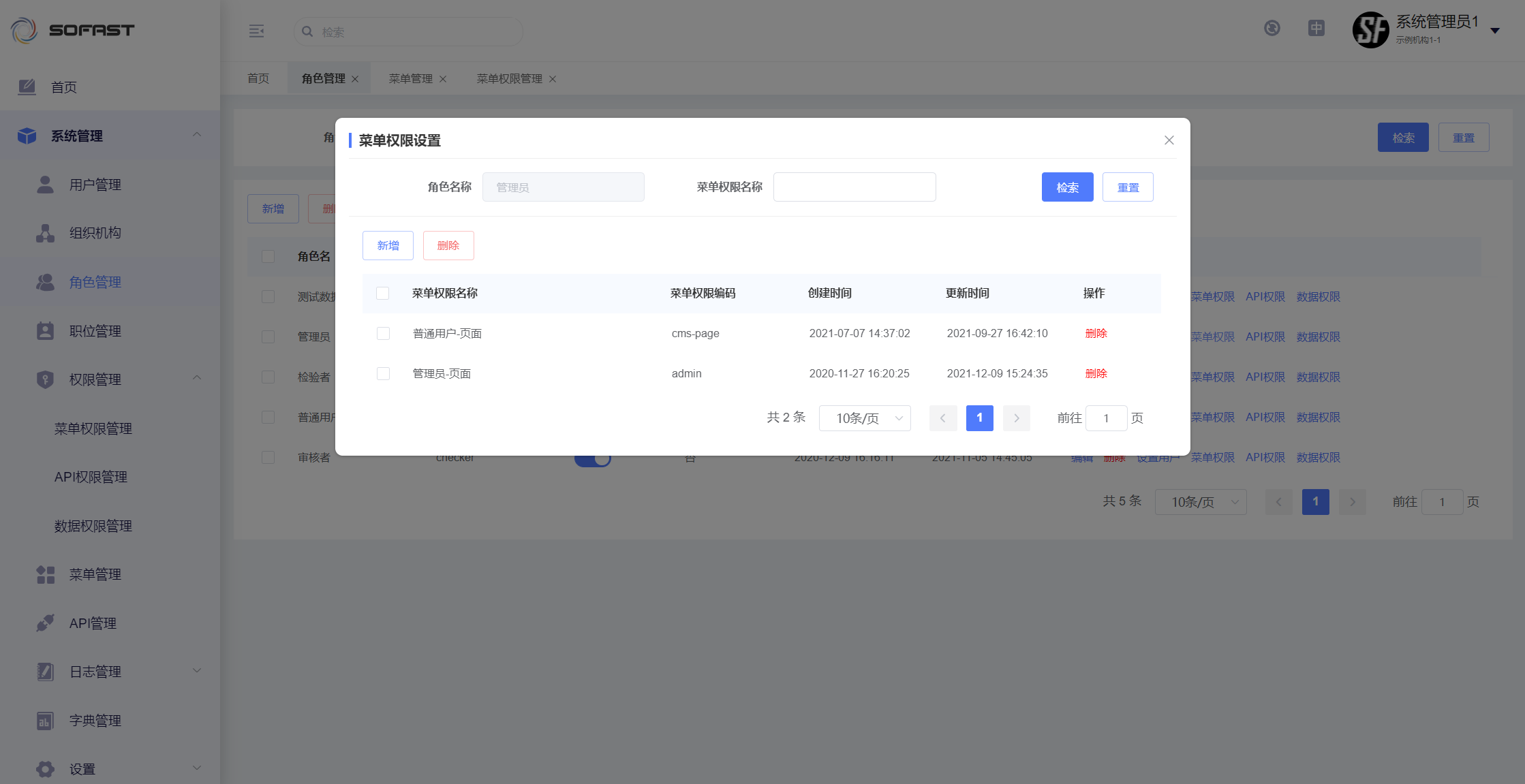 通过菜单权限按钮设置该角色的菜单权限,而菜单权限中设置了前台的页面和按钮,用户绑定了角色,从而达到了用户根据角色可以操作哪些前台页面和按钮的目的,即用户拥有的菜单权限。